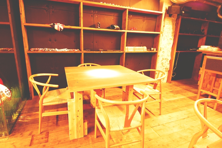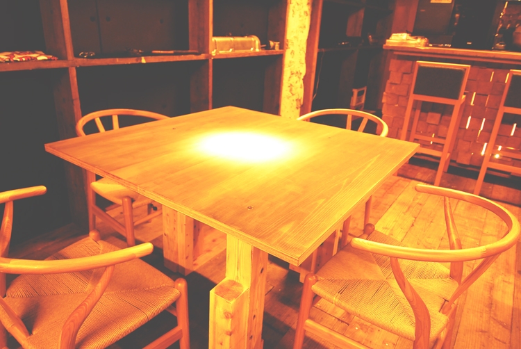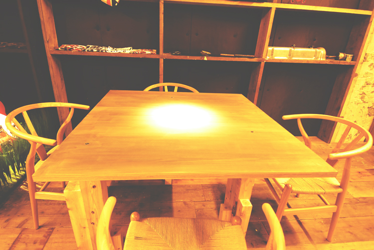 1.2M×1.2Mの大きめのダイニングテーブルです。テーブルの足を変則の3本とし、内装に合わせた形状としています。素材は天板を杉合板の墨塗装とし、足は杉の角材を使用しています。足と天板を脱着式として、天板は2つ折りにたたむことが可能なので、収納することも可能です。