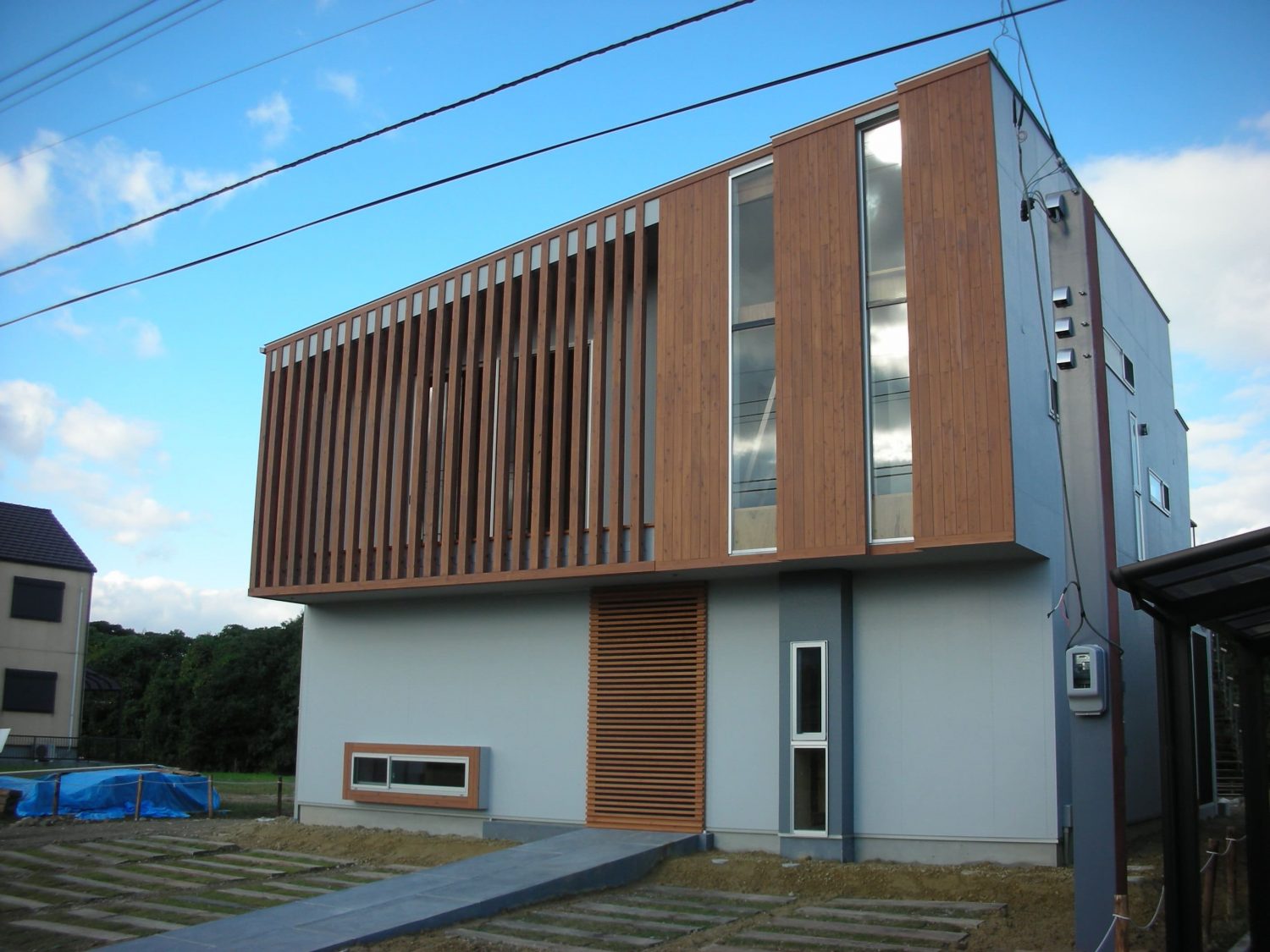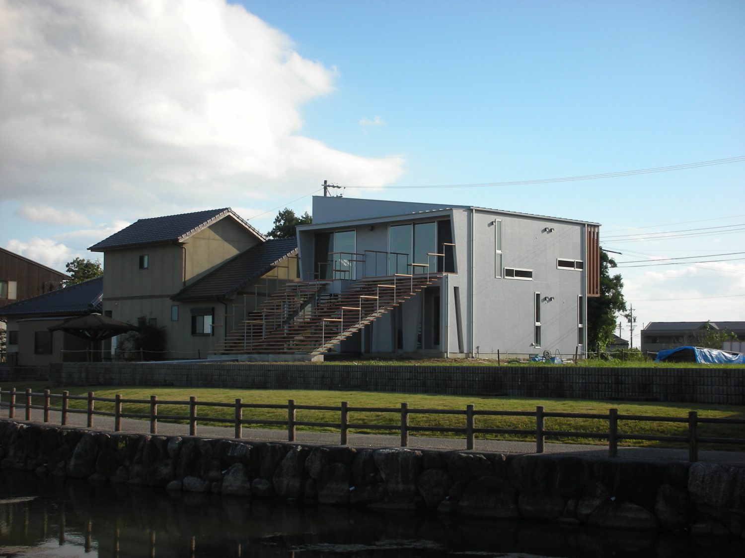 敷地は自然環境の優れた地域にあります。敷地の前面には遊歩道、池、森林が広がっています。そのロケーションを生かし、リビング等を眺めの良好な2Fに配し、大開口、ルーフバルコニー、開口いっぱいの池へとつながる階段を計画しました。下りる為だけの階段ではなく、腰かけたり、外部とのつながりを実現する住宅です。