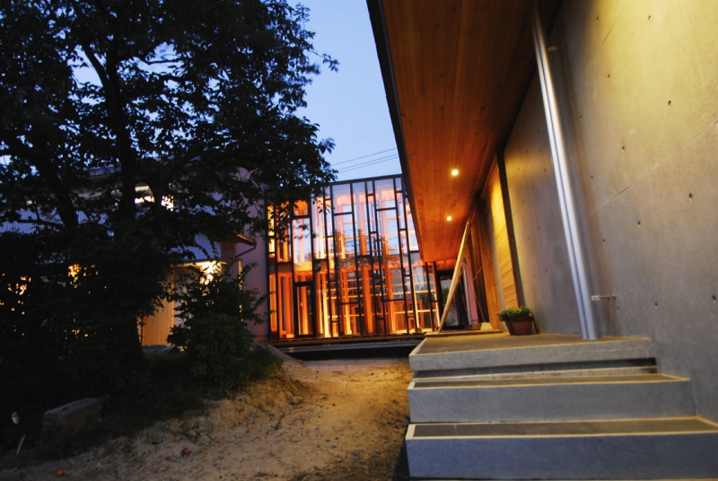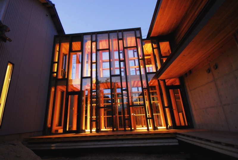 透明感の強い硝子によって敷地の外と中庭とを視覚的につなげることによって視線の広がりを意図しました。